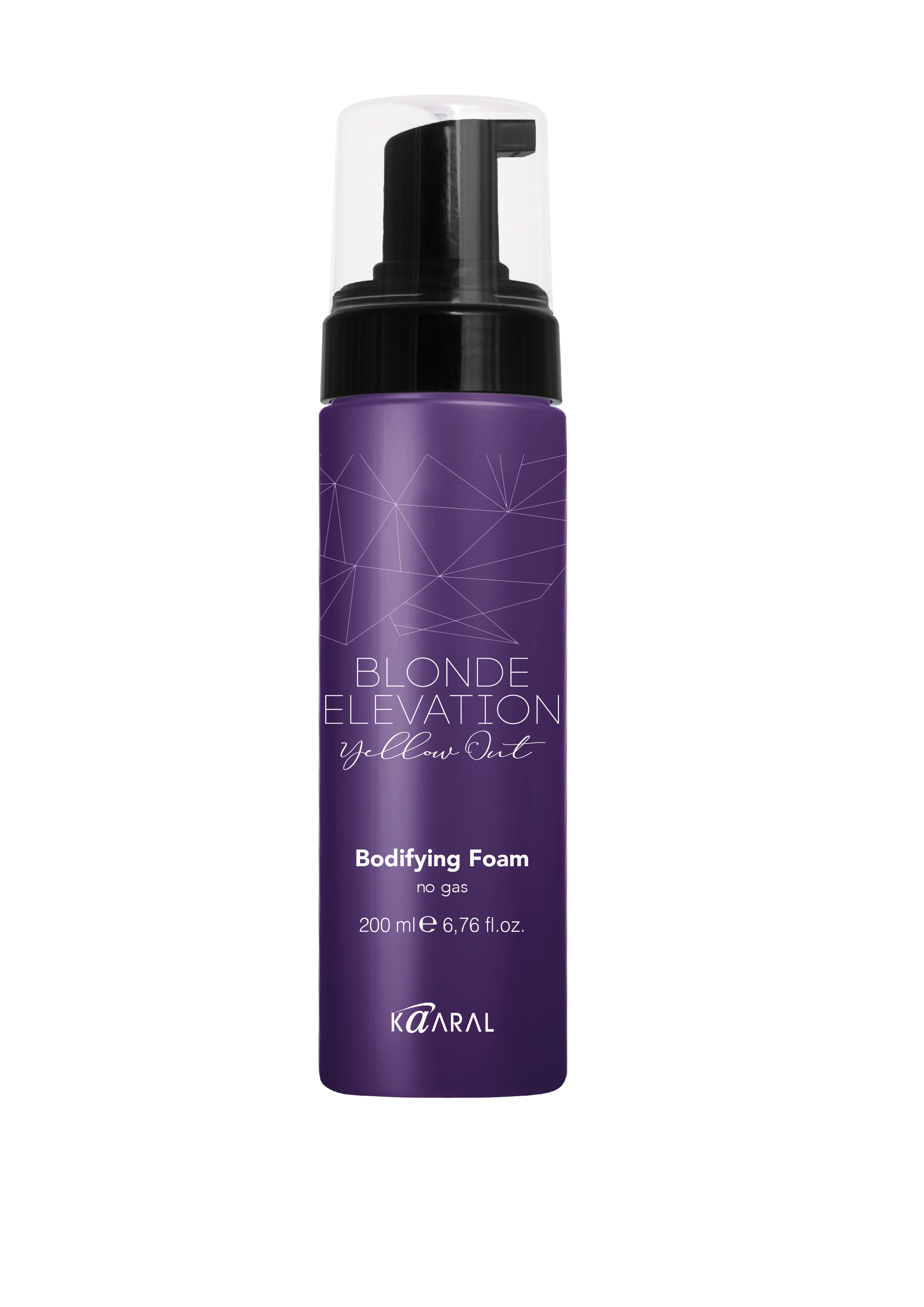Blonde Elevation Bodifying Anti-Yellow Foam with violet pigment. Ideal for bleached, white, grey, and highlighted hair. It eliminates unwanted yellow undertones, adds volume and body, and restores the elasticity of treated hair.
