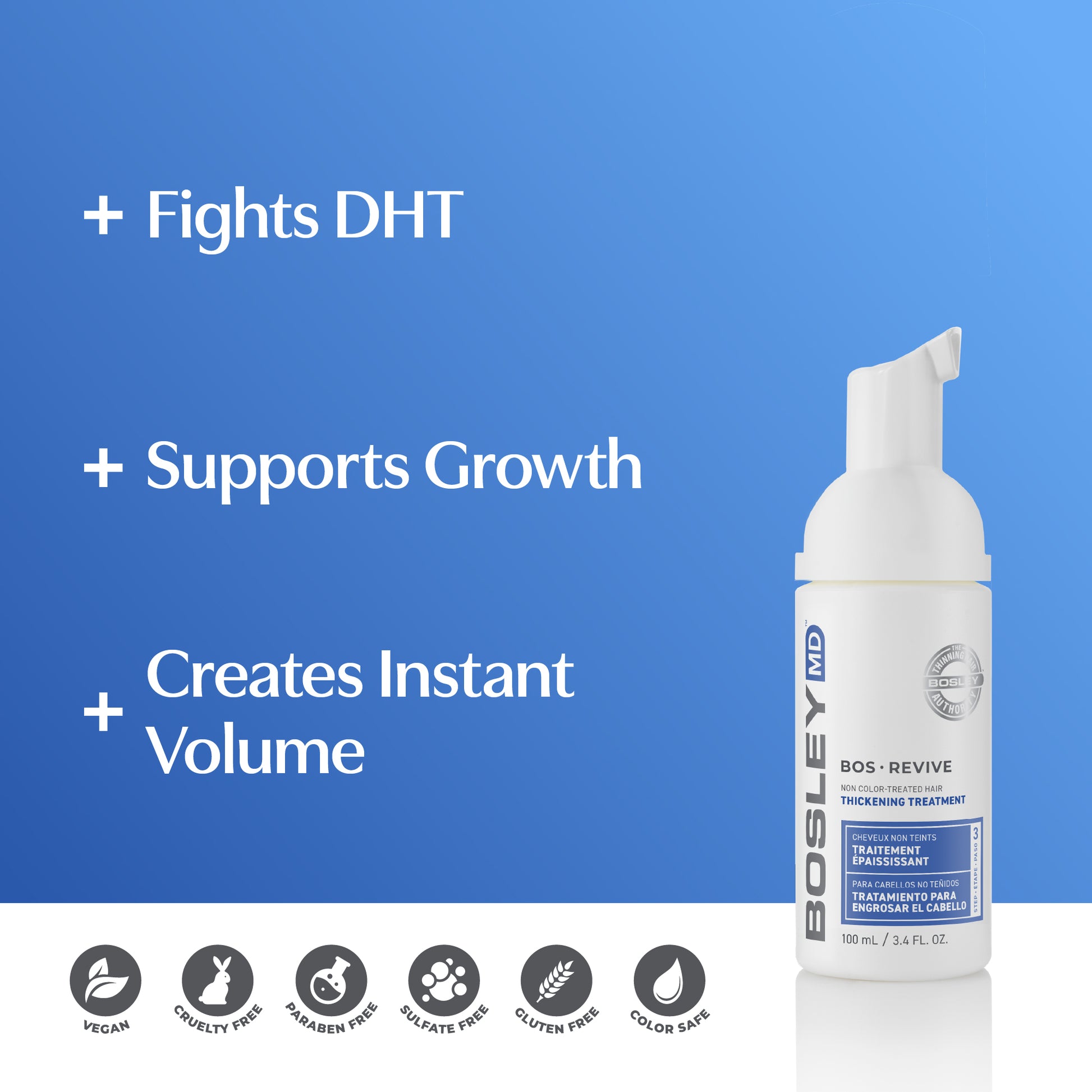 BosRevive Leave-In Thickening Treatment, designed to help inhibit DHT, is a lightweight, foaming, alcohol-free intensive treatment may aid in rejuvenating the scalp and help support the growth of stronger, healthier hair. Pumpkin Seed Extract and Soy Proteins, natural DHT-Blockers, combine with Apple Stem Cell Extract and Panthenol to help reduce scalp inflammation, increase scalp circulation and strengthen the hair to promote healthy hair growth. May assist in thickening hair, reconditioning fragile hair and provide instant volume.