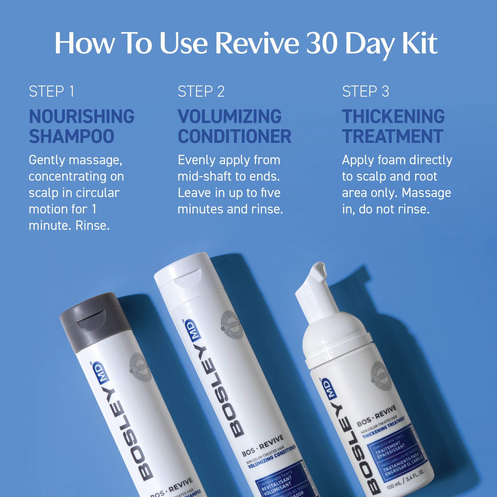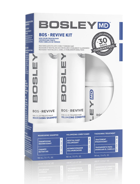 Help restore visibly thinning hair with BosRevive 30-Day Kit designed for Non Color Treated Hair featuring a simple, 3-step system including a Nourishing Shampoo, Volumizing Conditioner and Leave-In Thickening Treatment.
