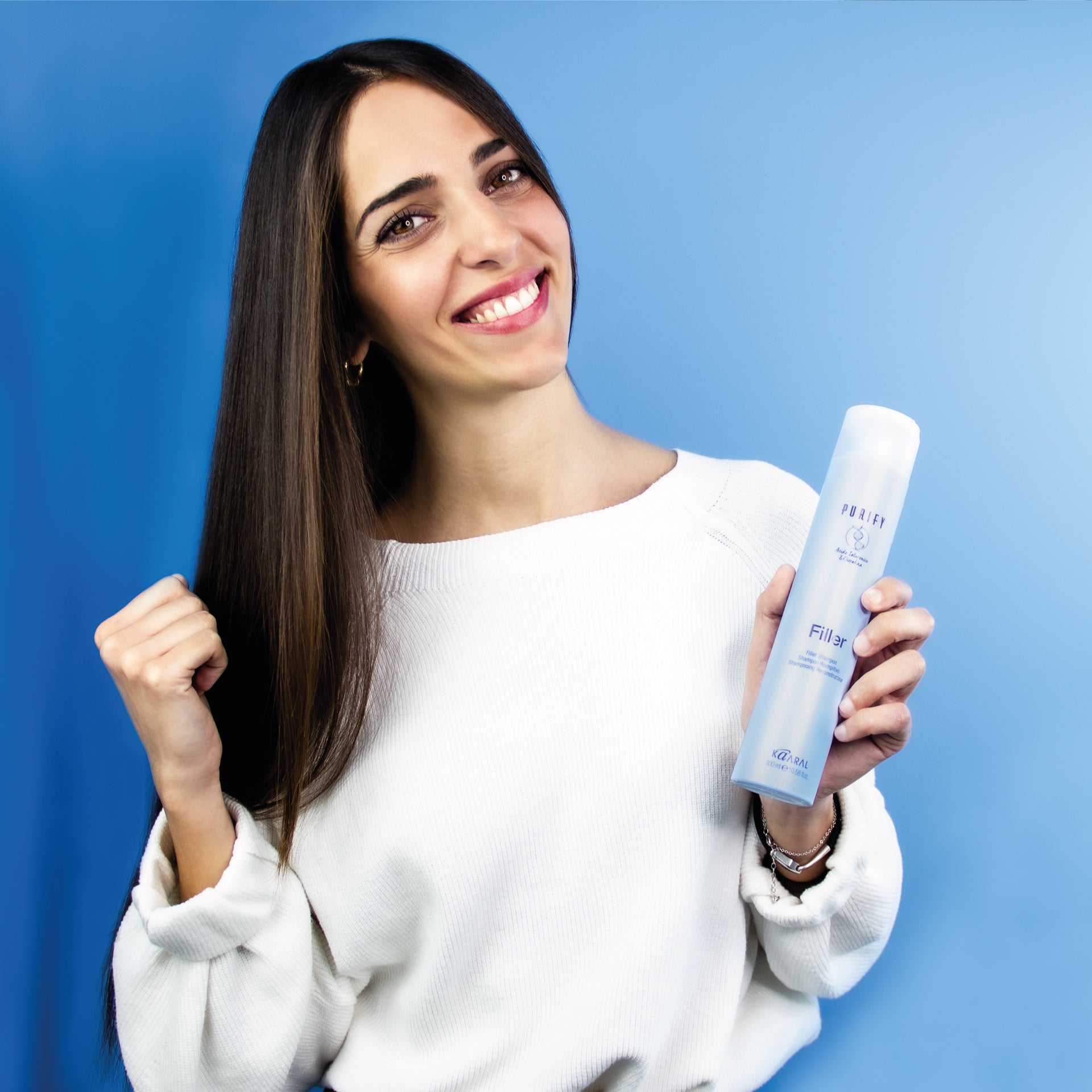 Delicately cleanses the scalp and hair, restructuring the damaged fiber and strengthening the shaft right along the length of the hair, thanks to the combined action of the Keratin and Hyaluronic Acid. The hair immediately appears more nourished and disciplined, ready to receive the Filler treatment.